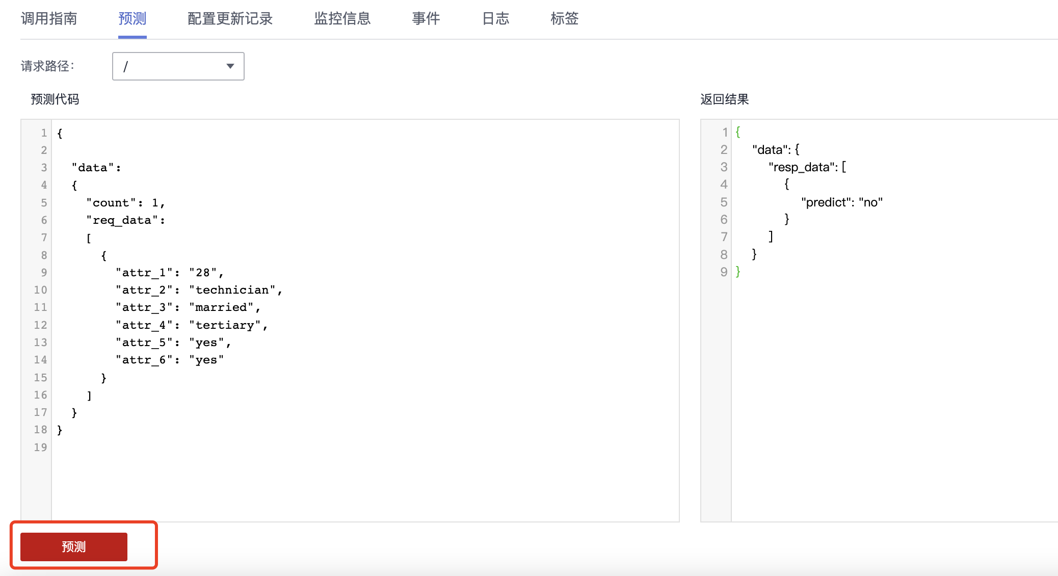 3、输入预测数据,单击左下角的“预测”,在右边的“返回结果”区域查看预测结果。