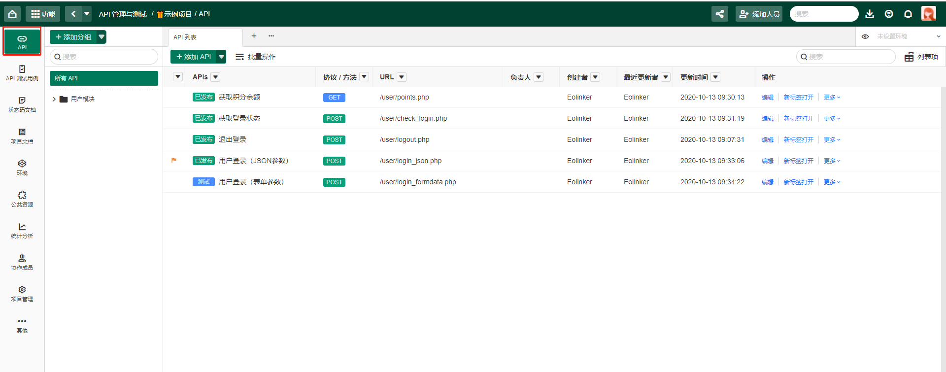 这个国产软件就是Eolink,结合了 API 设计、文档管理、自动化测试、监控、研发管理和团队协作的一站式 API 生产平台,还集成 Gitlab、Jenkins、钉钉、企业微信、飞书等平台,满足API团队协作和流程自动化的所有功能。