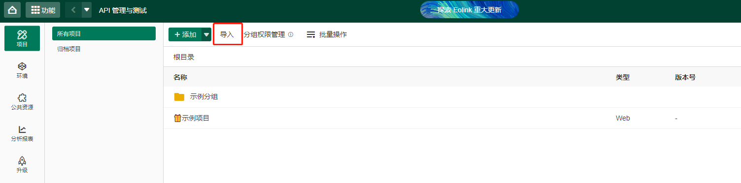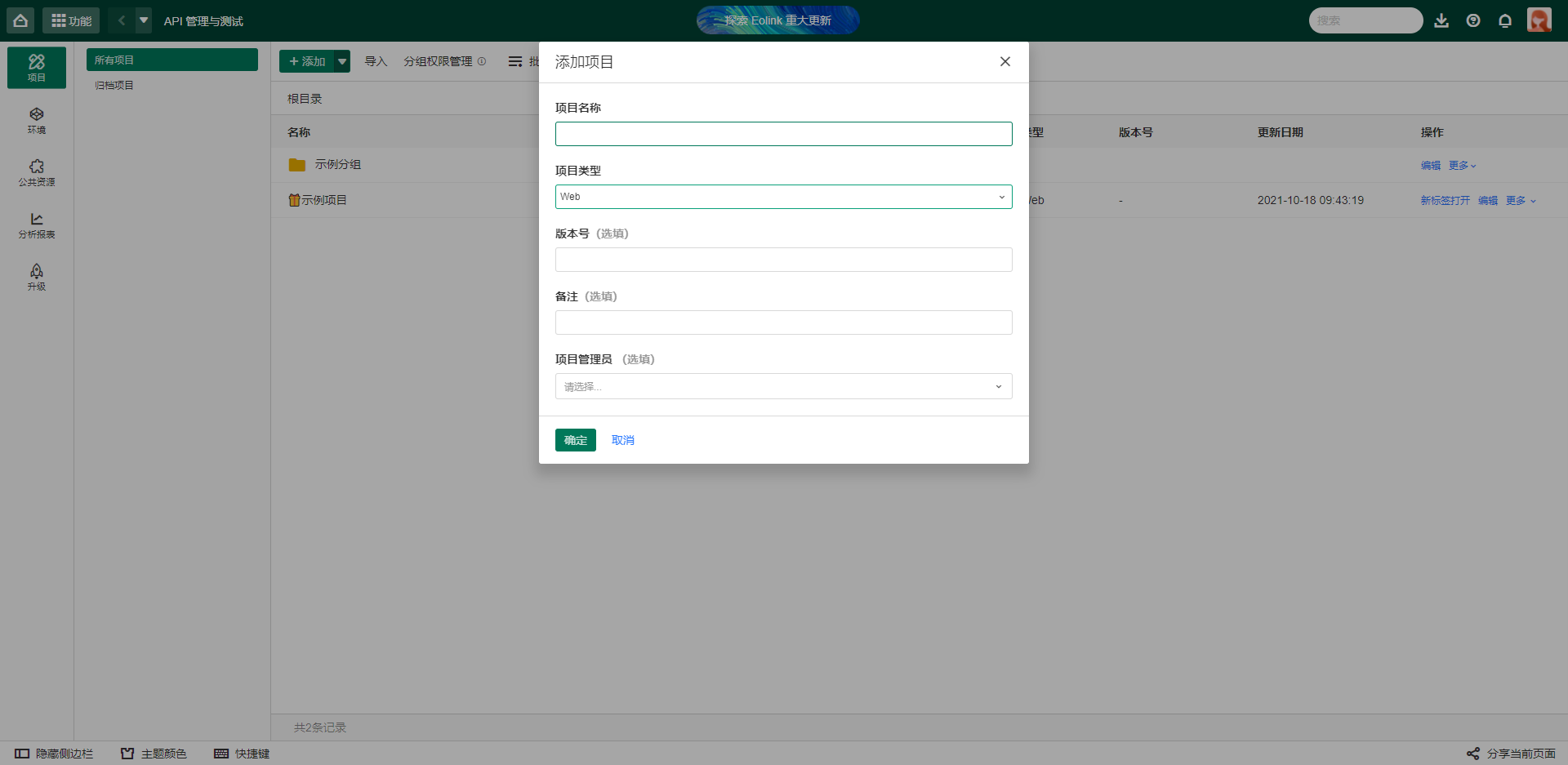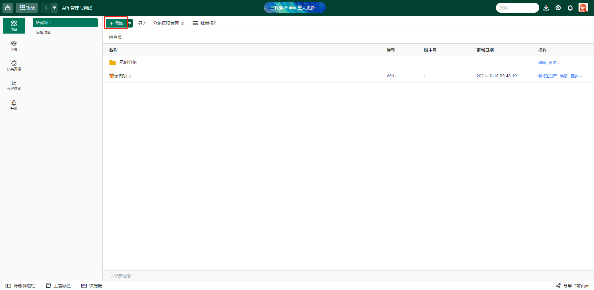 除了创建 API 项目,还可以创建项目组来对项目进行分类或者设置统一的用户操作权限。