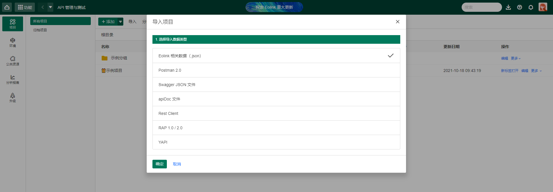 除了手动创建项目,系统也提供了一键导入 Swagger、Postman、RAP、YAPI 等产品数据的功能。