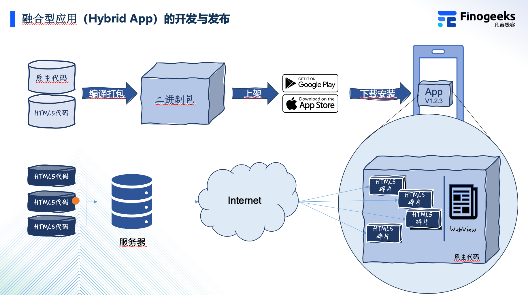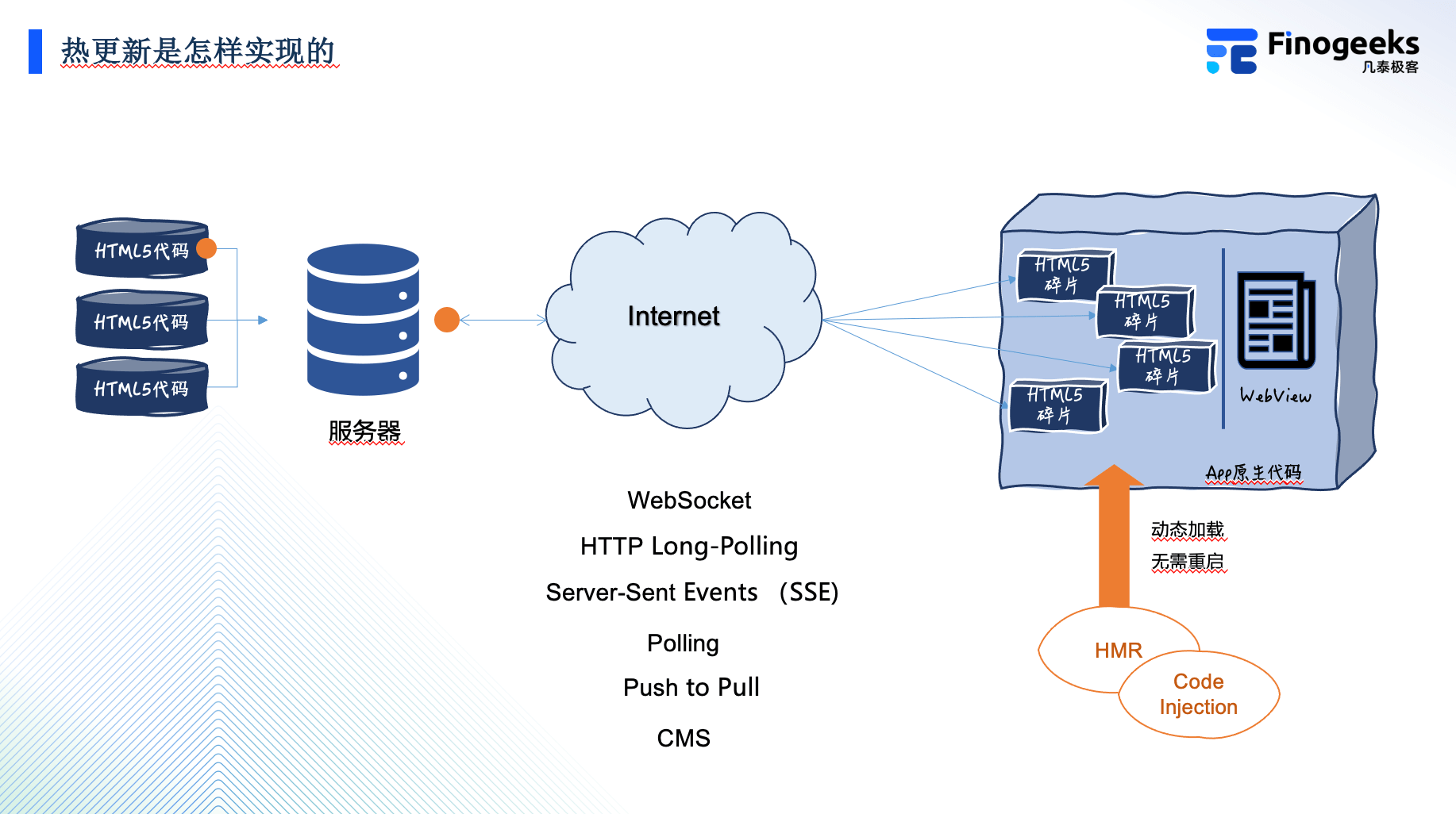 通常 APP 的服务器端要监测这些内容的更新,然后向设备端的 APP 以某种技术手段发送内容更新的通知,然后 APP 里的一些组件,需要向客户端通过网络同步一些页面内容碎片,并且把这些下载的内容,一般情况是 HTML 和 JavaScript,注入到之前挖好的这些洞洞里。