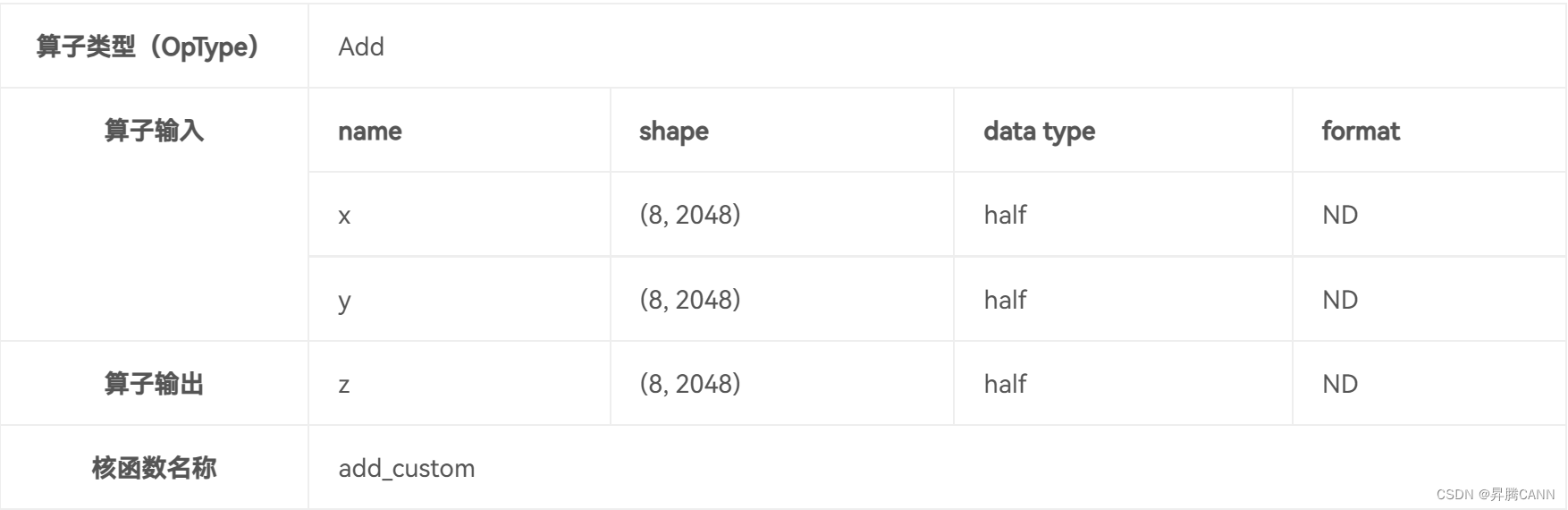 例子以Add算子为例,数学公式:z= x+y,为简单起见,设定输入张量x, y,z为固定shape(8,2048),数据类型dtype为half类型,数据排布类型format为ND,核函数名称为add_custom。