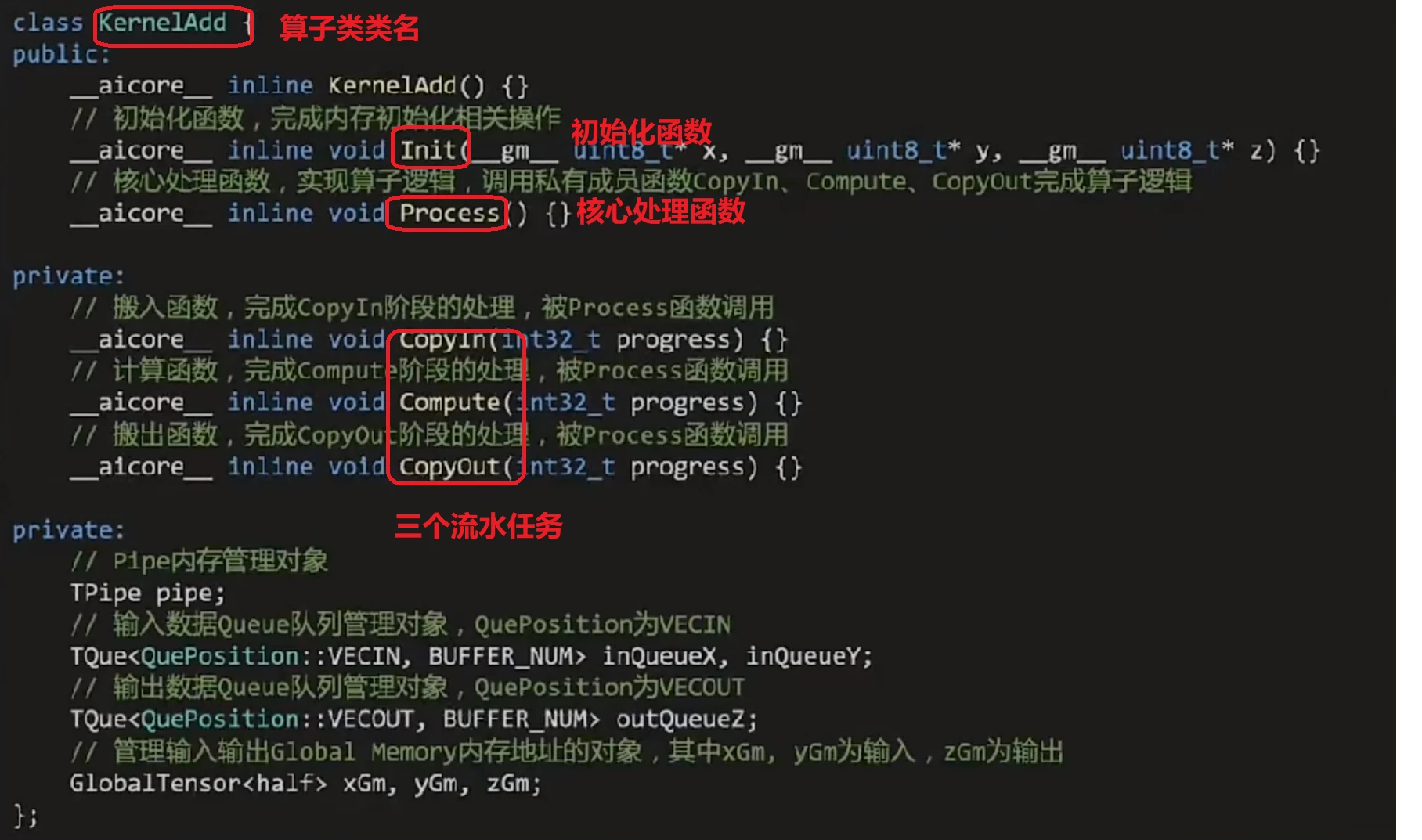 在add_custom核函数的实现中实例化kernelAdd算子类,调用Init()数完成内存初始化,调用Process()函数完成核心逻辑。