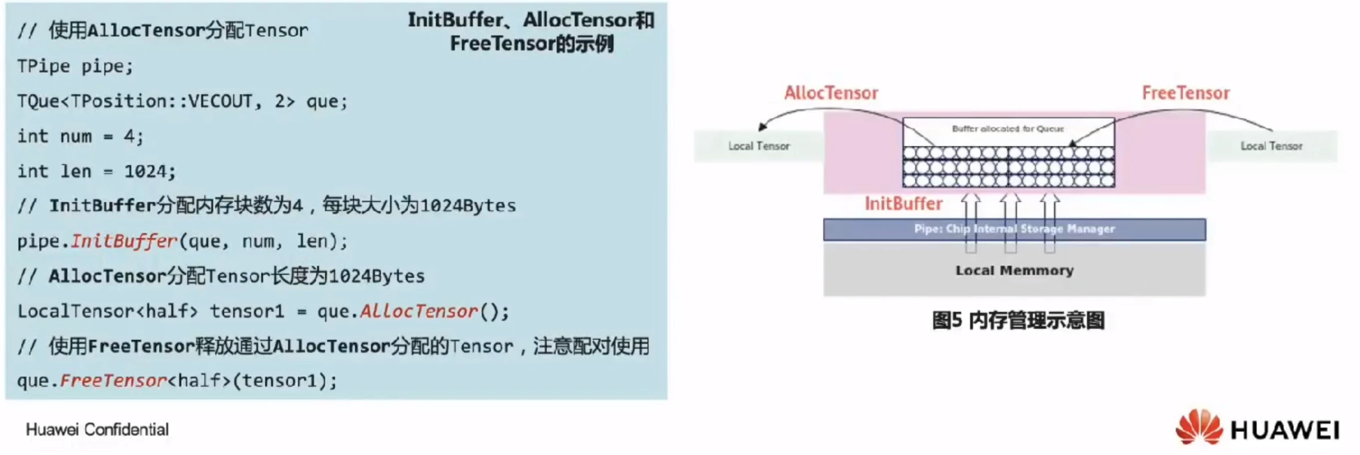 任务间数据传递使用到的内存统一由内存管理模块Pipe进行管理。Pipe作为片上内存管理者,通过InitBuffer接口对外提供Queue内存初始化功能,开发者可以通过该接口为指定的Queue分配内存。