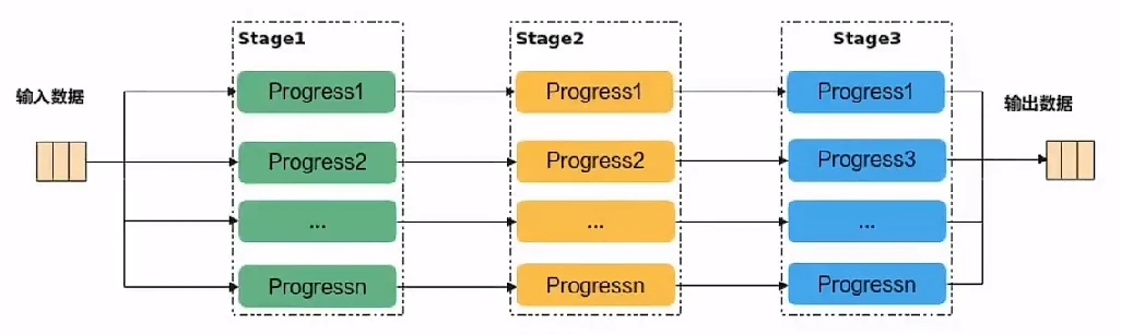 若n=3,即待处理的数据被切分成3片,则上图中的流水任务运行起来的示意图如下,从运行图中可以看出,对于同一片数据,Stage1、Stage2、Stage3之间的处理具有依赖关系,需要串行处理;不同的数据切片,同一时间点,可以有多个任务在并行处理,由此达到任务并行、提升性能的目的。