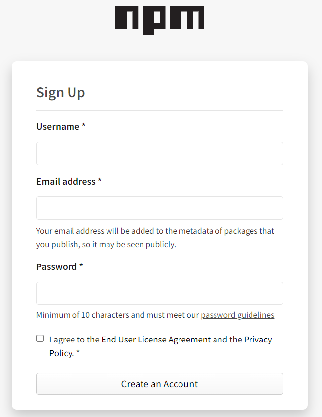 既然要发布到npm,肯定要先去注册账号,跟Android中的aar发布到远程Maven类似,没有一个平台的账号,是无法执行下一步的。