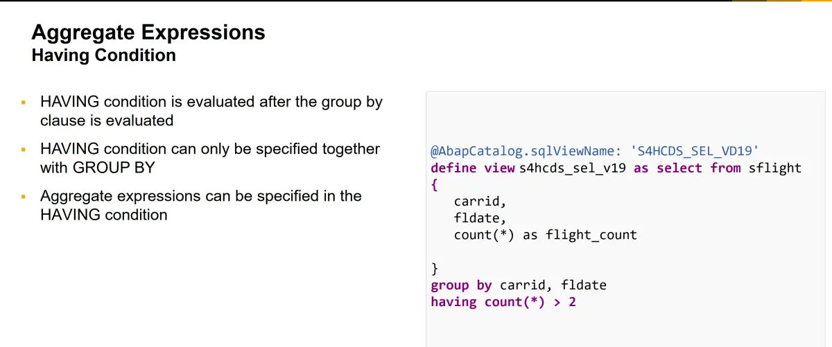 在 ABAP CDS view 中,HAVING 关键字的用法与 SQL 中类似。以下是一个简单的例子: