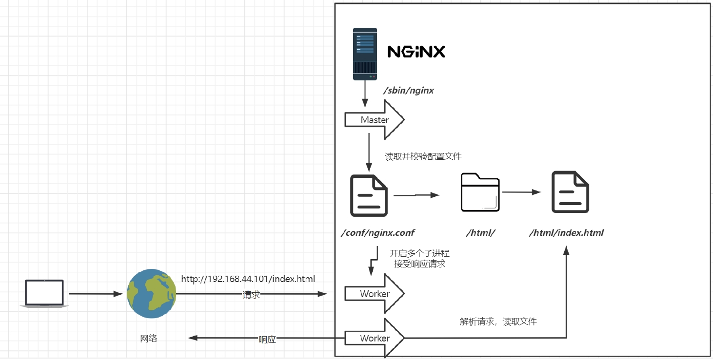 一共有多个进程,其中有一个主进程Master负责读取,校验配置文件。