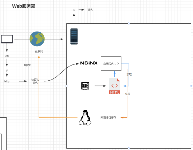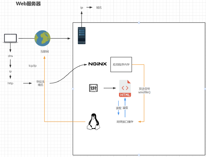 请求信息让操作系统收到,操作系统的网络接口转发请求到Nginx(请求前绑定注册端口)。如果关闭 sendfile on; 则Nginx先根据配置文件读取SSD上的文件到应用程序中,然后再发送到操作系统的网络接口(即网卡的驱动程序),这个过程会经过调度,网卡的缓存以及内核的缓存,层层缓存复制。