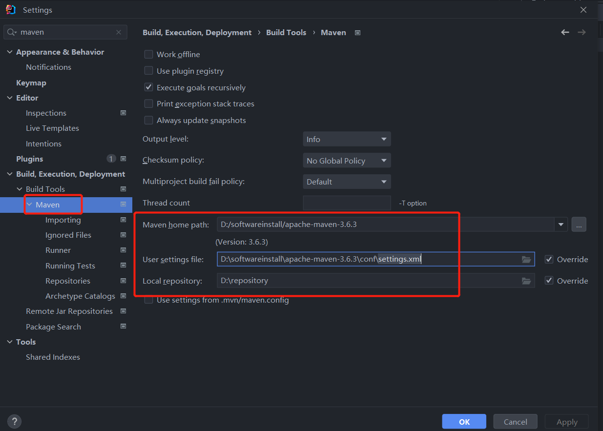 首先我们需要在idea中配置Maven。Maven home path也就是Maven的安装目录,然后使用本地仓库即可。