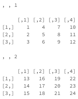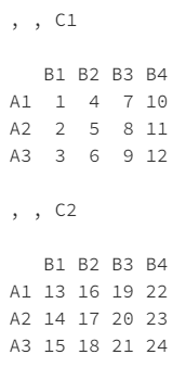 print(array(1:24, dim = c(3, 4, 2), dimnames = list(dim1, dim2, dim3)))