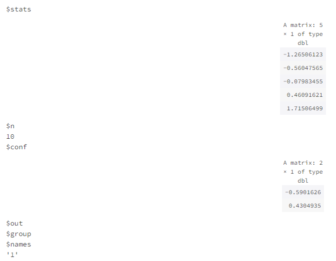 这里列表 bp 包含了多个对象,如果想查看或使用某一个对象,只需用“$”符号引用。例如,要查看列表 bp 中的对象 stats 的内容,可以输入 bp$stats 。对列表中其他对象感兴趣,请移步 boxplot.stats 的说明文档。