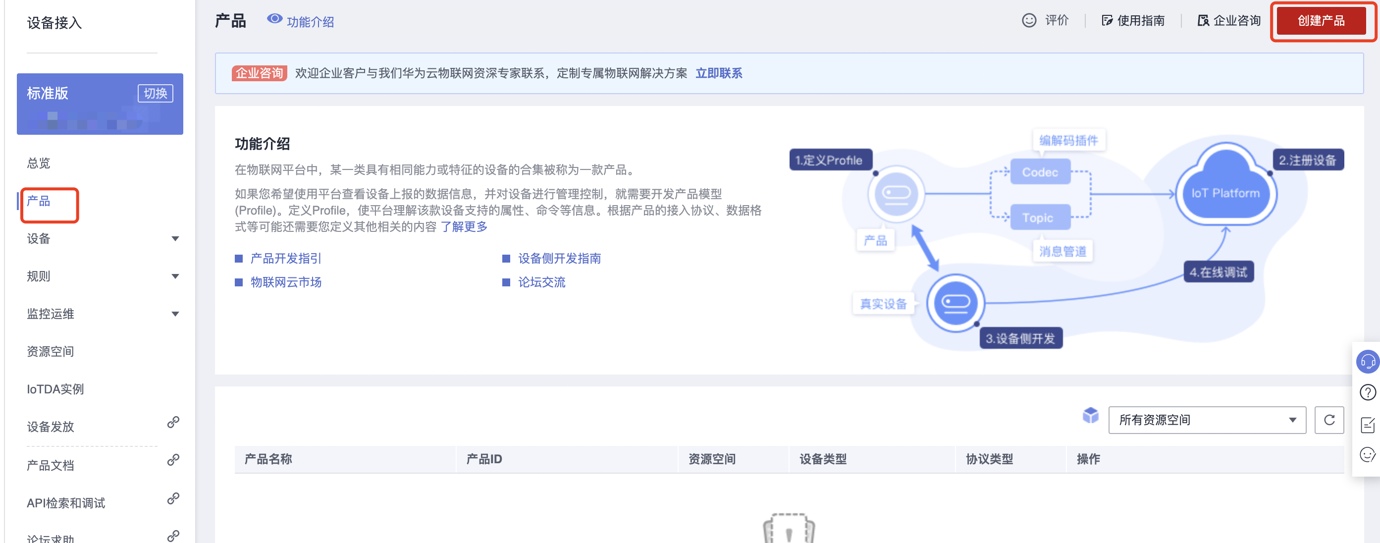 2、选择左侧导航栏的“产品”,单击右上角的“创建产品”。