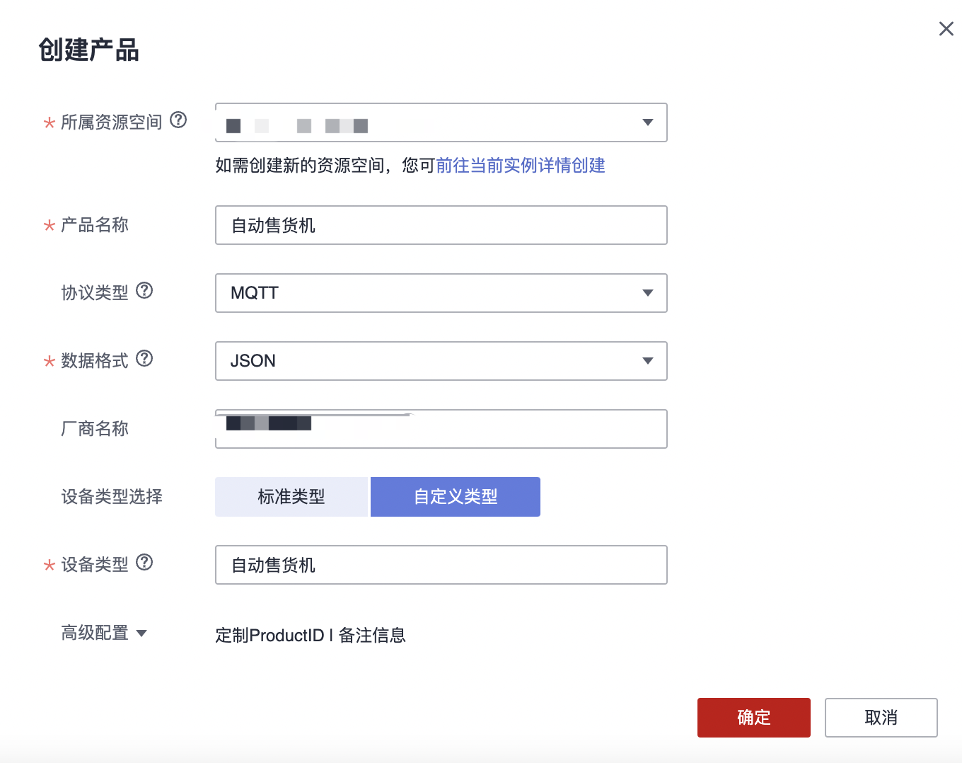 3、创建一个基于MQTT协议的产品,填写参数后,单击“确认”。