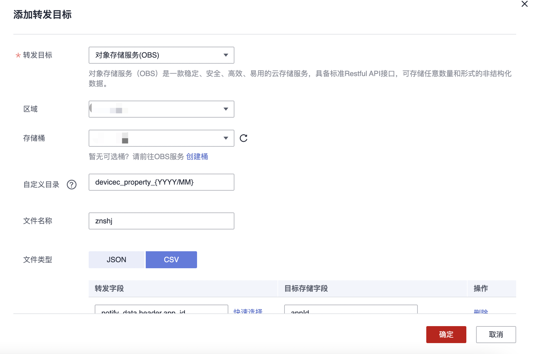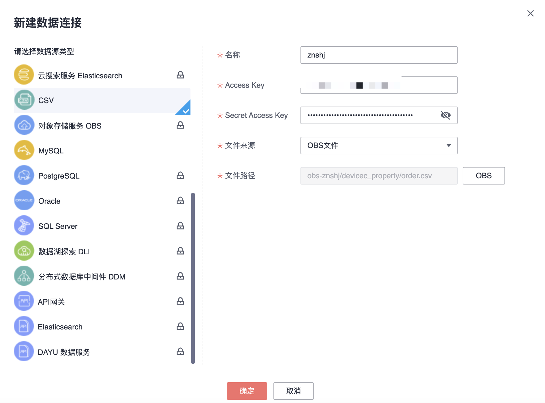 2、新建CSV文件数据连接中文件来源选择OBS文件,文件路径选择创建规则时指定的转发目标。