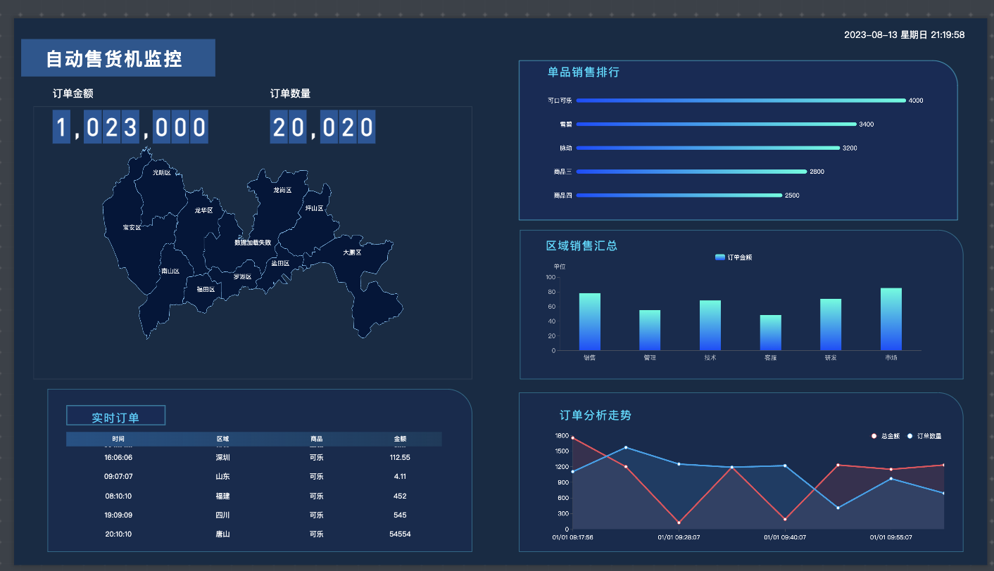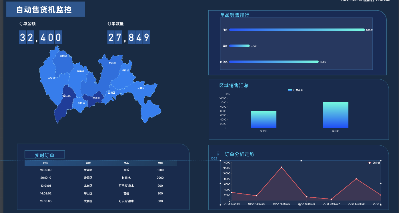 4、大屏进入编辑页面,分别设置每个组件的数据源,实现如下效果。