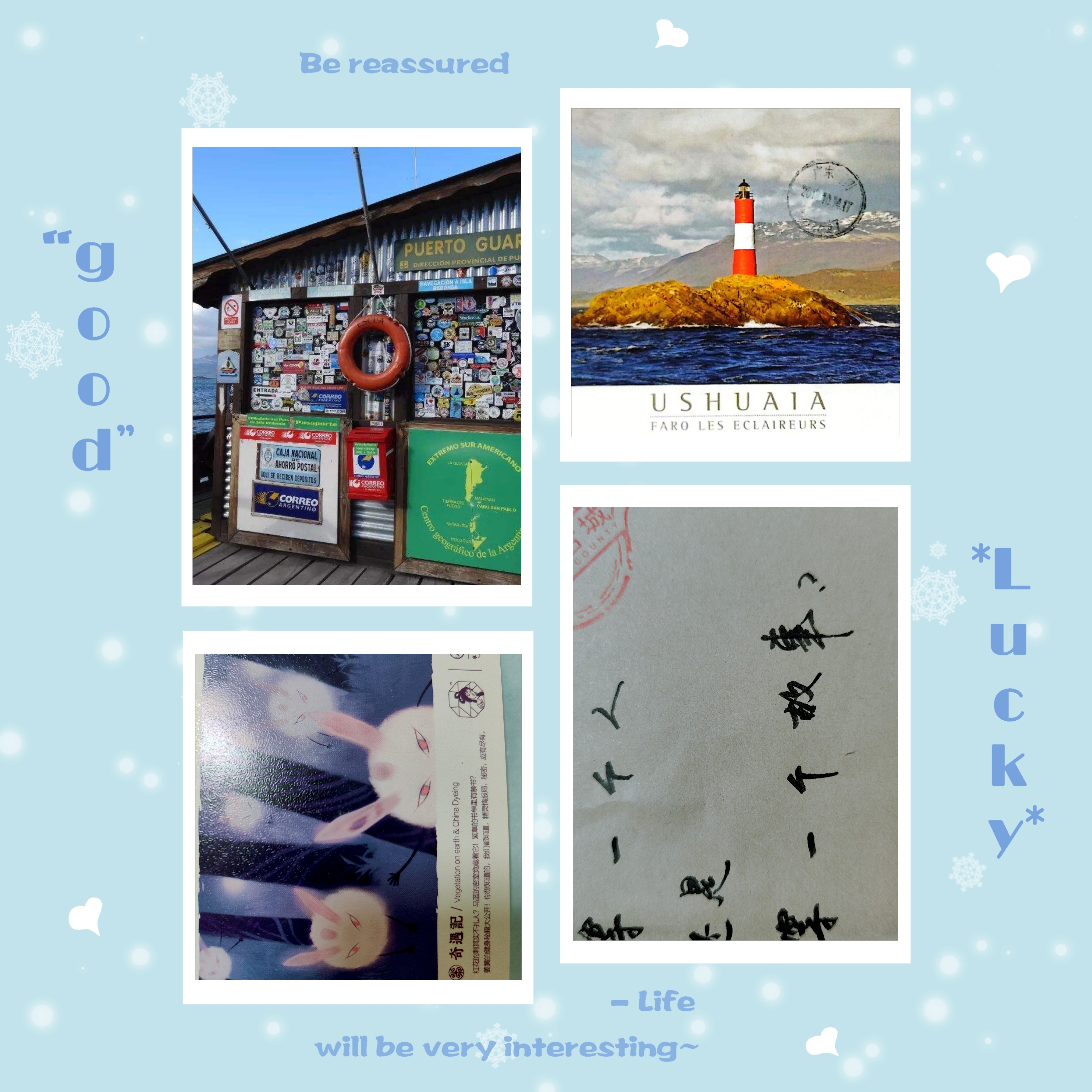 再后来,无论是电子贺卡,还是纸质贺卡,都逐渐淡出大众的视野。偶尔,出去旅游,会购买当地特色的明信片作为伴手礼。听说在有「世界尽头」之称的乌斯怀亚,有一间小邮局,如果有机会还蛮想去,买一张明信片,上面有“世界尽头邮政”字样,可以买来现场填写地址后邮寄到全球各地。