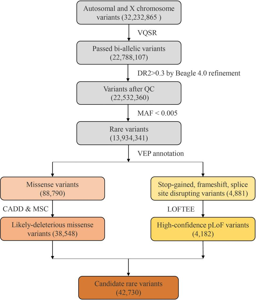 在本研究中,研究者通过对近500例中国人群遗传背景的Covid-19患者进行全基因组测序。通过预测和注释,研究者筛选出候选罕见变异,并通过在重症和非重症患者中的基因水平分析、通路水平分析、罕见变异积累效应分析以及蛋白-蛋白互作分析等分析手段对候选的罕见变异进行了进一步探索。最终,本研究发现了几种与Covid-19相关的通路以及4个在中国人群中特有的候选基因。