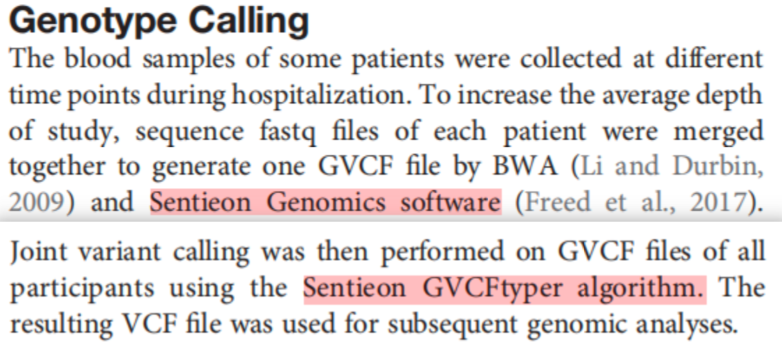 该研究通过对近500例患者进行全基因组测序,经过严格的数据质控最终纳入重症患者292人,非重症患者159人。通过重症和非重症患者中罕见变异在基因水平及通路水平的关联分析及罕见变异积累效应和蛋白-蛋白互作分析等,最终发现了几种与Covid-19严重程度相关的通路和4个在中国人群遗传背景中特有的相关候选基因。在研究过程中,Sentieon软件被用于单个样本的序列比对到变异检测分析以及多样本联合基因分型。