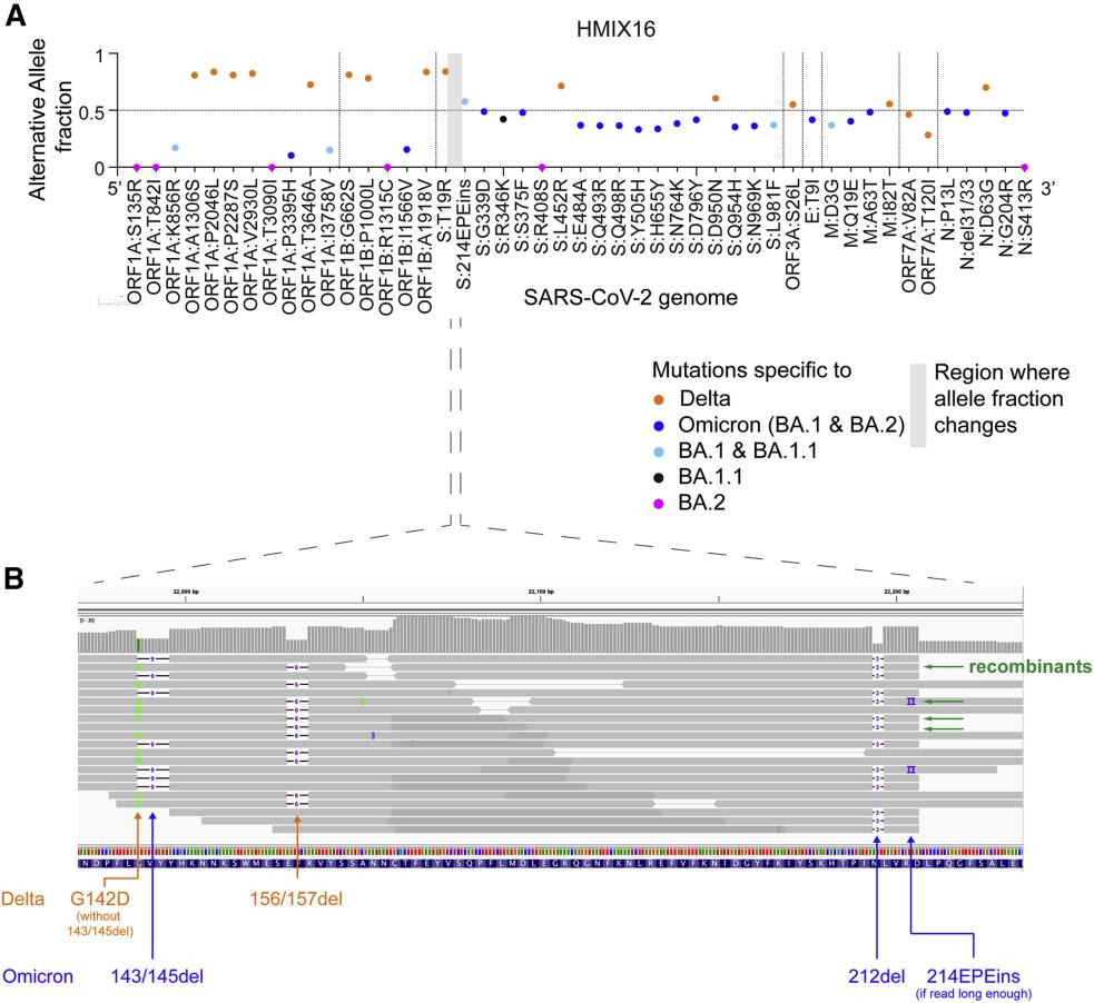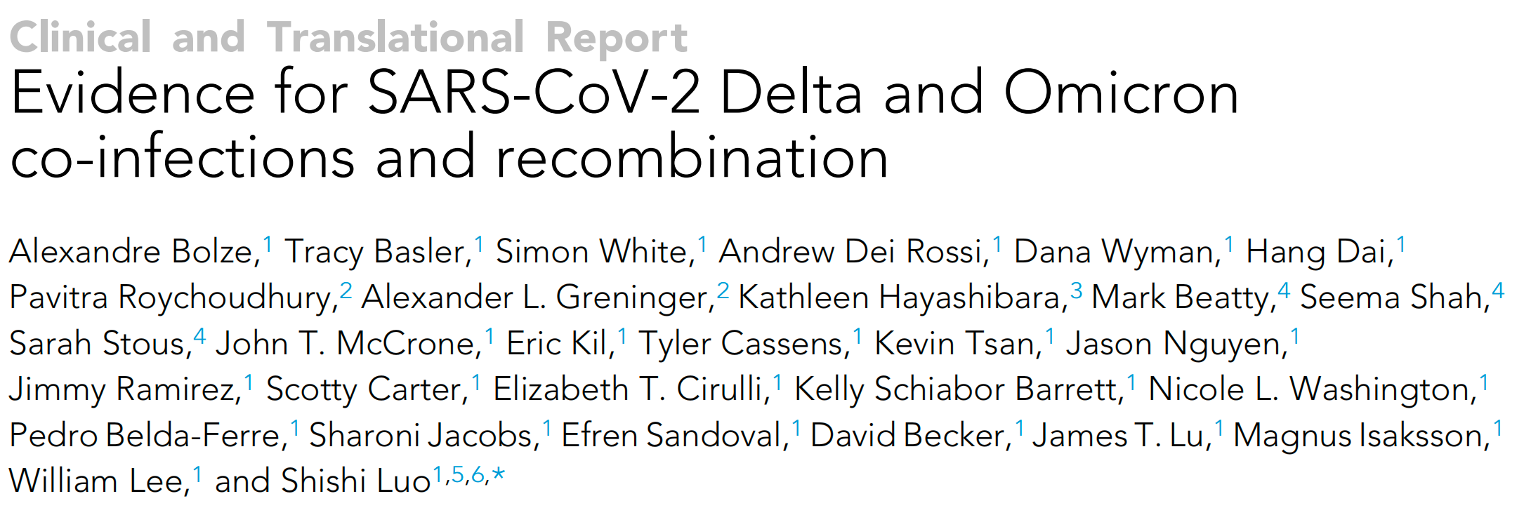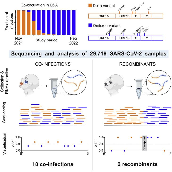 在2021年11月到2022年2月期间,SARS-Cov-2在美国出现德尔塔和奥秘可容变异株共同传播并导致共感染。研究者通过对流行期29719个阳性样本进行研究。最终发现18例患者存在德尔塔和奥密克戎共感染,其中一例患者检测到德尔塔和奥密克戎重组病毒的证据。