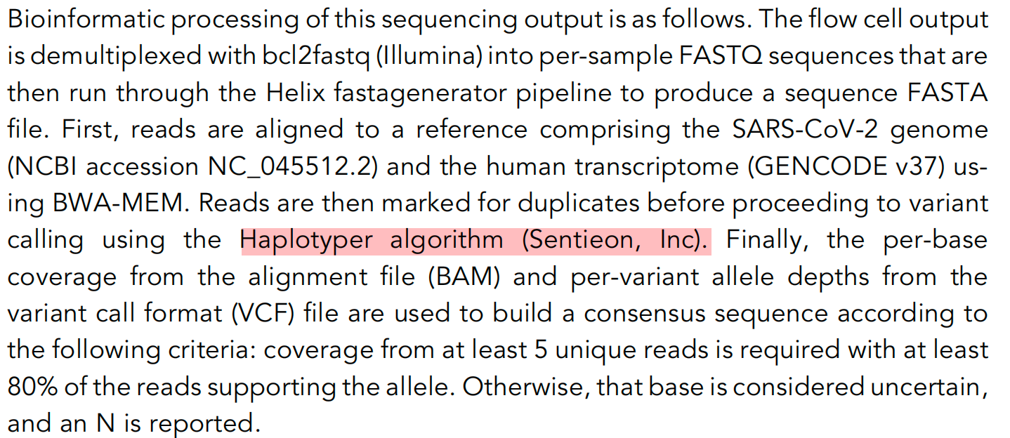 该研究通过对29719样本进行测序,确定并验证了18例与德尔塔和奥密克戎共感染的病例,并在其中一例患者中发现了德尔塔和奥密克戎重组的证据。然而,无法确定是两种病毒同时感染该患者或是仅感染了德尔塔和奥密克戎重组毒株。无论是那种情况,重组德尔塔-奥密克戎重组体没有显示出增加了宿主间的传播能力。在数据分析部分,Sentieon的Haplotyper算法被用于变异检测。