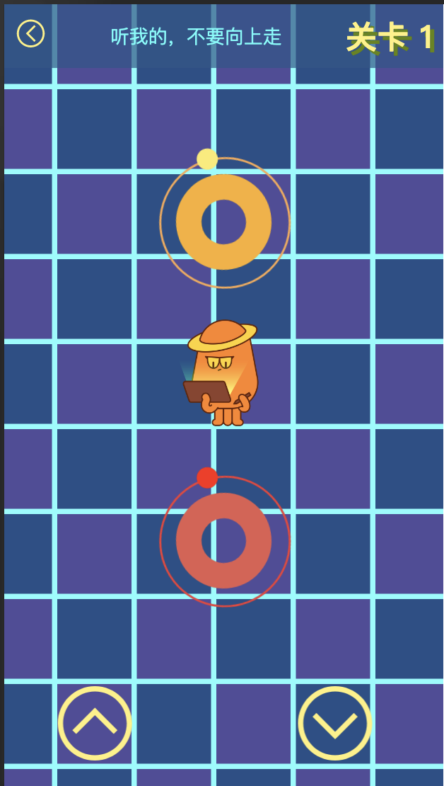 第一个关卡,我们先来看都有哪些元素。提示写的「不要向上走」,确实,我们的游戏也叫这个。那往下走呢?