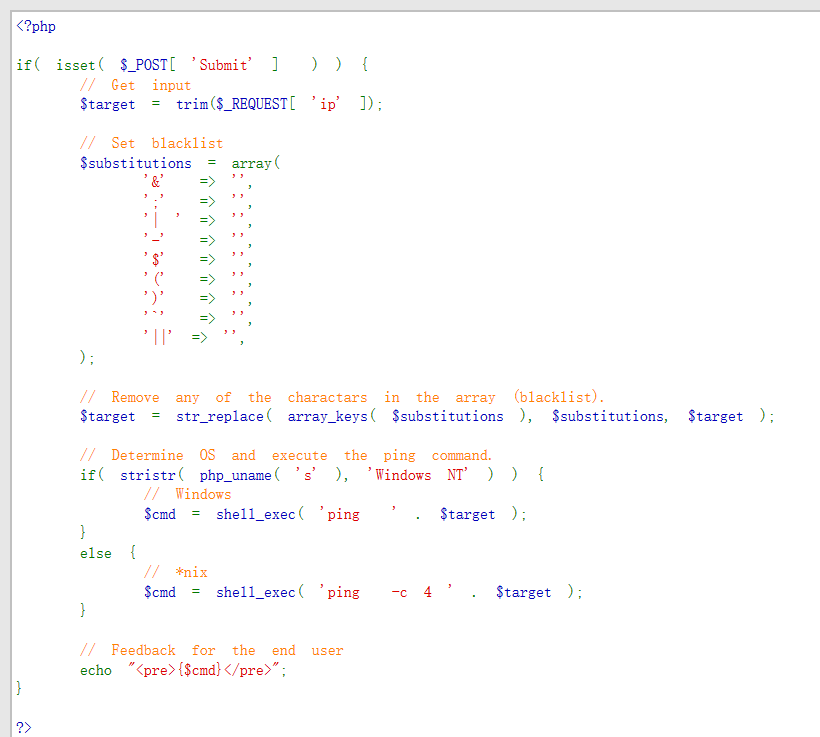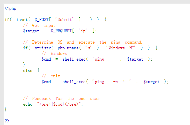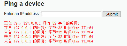 通过源码可以看出,源码只是针对不同的操作系统执行不同的ping命令而已,没有对ip参数并未做任何的过滤,因此存在命令注入漏洞。