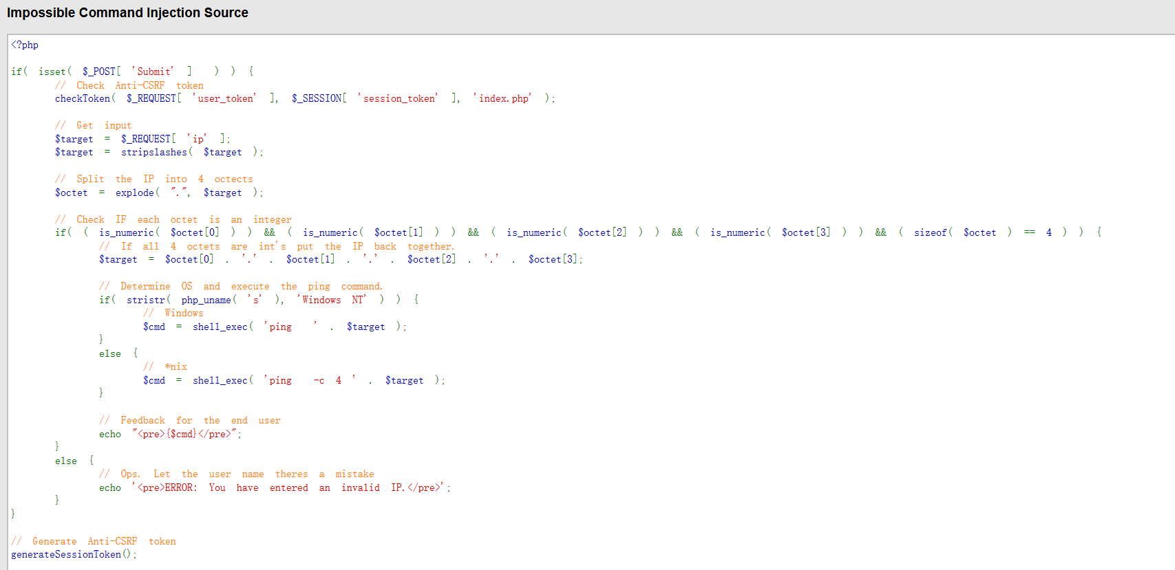 Impossible级别的代码加入了Anti-CSRF token,同时对参数ip进行了严格的限制,只有“数字.数字.数字.数字”的输入才会被接收执行,因此不存在命令注入漏洞。