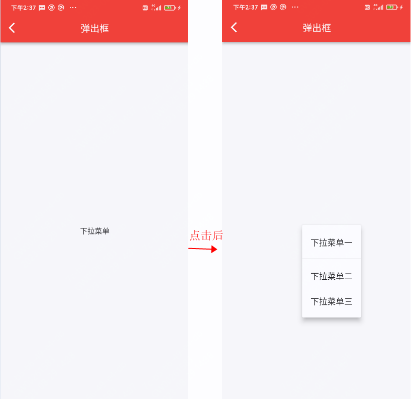 最近要使用Flutter实现一个下拉菜单,需求就是,在当前组件下点击,其下方弹出一个菜单选项,如下图所示: