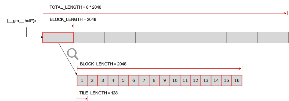 这样单核上的数据(2048个数)被切分成16块,每块TILE_LENGTH(128)个数据。Pipe为inQueueX分配了两块大小为TILE_LENGTH * sizeof(half)个字节的内存块,每个内存块能容纳TILE_LENGTH(128)个half类型数据。数据切分示意图如下。