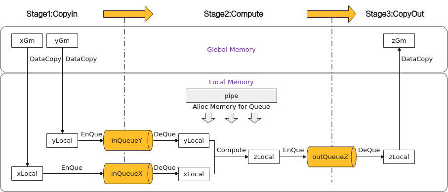 Ascend C编程范式是一种流水线式的编程范式,把算子核内的处理程序,分成多个流水任务:“搬入、计算、搬出”,通过队列(Queue)完成任务间通信和同步,并通过统一的内存管理模块(Pipe)管理任务间通信内存。开发者只需聚焦实现“搬入、计算、搬出”内容。