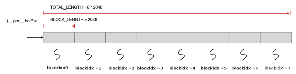 上文我们介绍到,本样例将数据切分成8块,平均分配到8个核上运行,每个核上处理的数据大小BLOCK_LENGTH为2048。那么我们是如何实现这种切分的呢?
