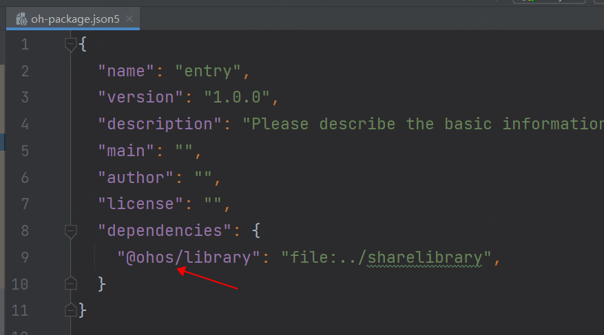 在entry中的oh-package.json5文件中,在dependencies中引入共享包sharelibrary,记住格式: