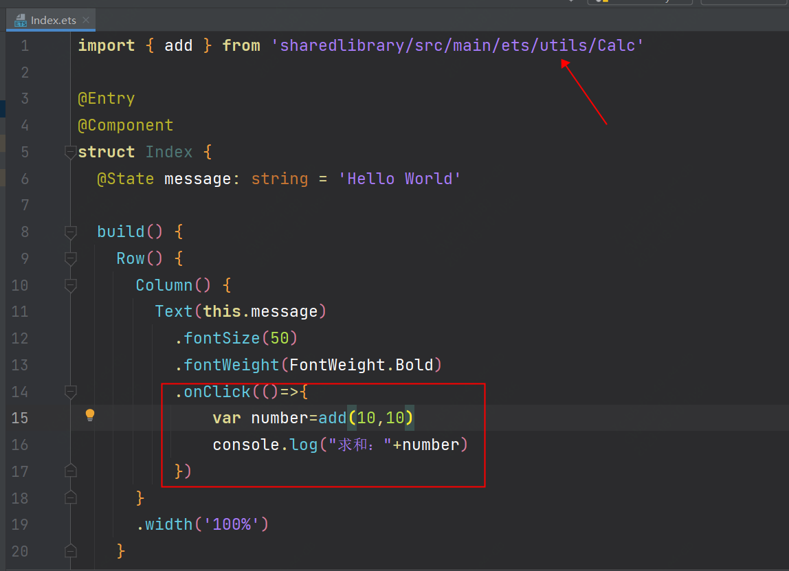 上述创建的共享包sharelibrary中,有一个工具类Calc,里面有一个简单的求和方法add,那么在entry中如何调用sharelibrary中的add方法呢?