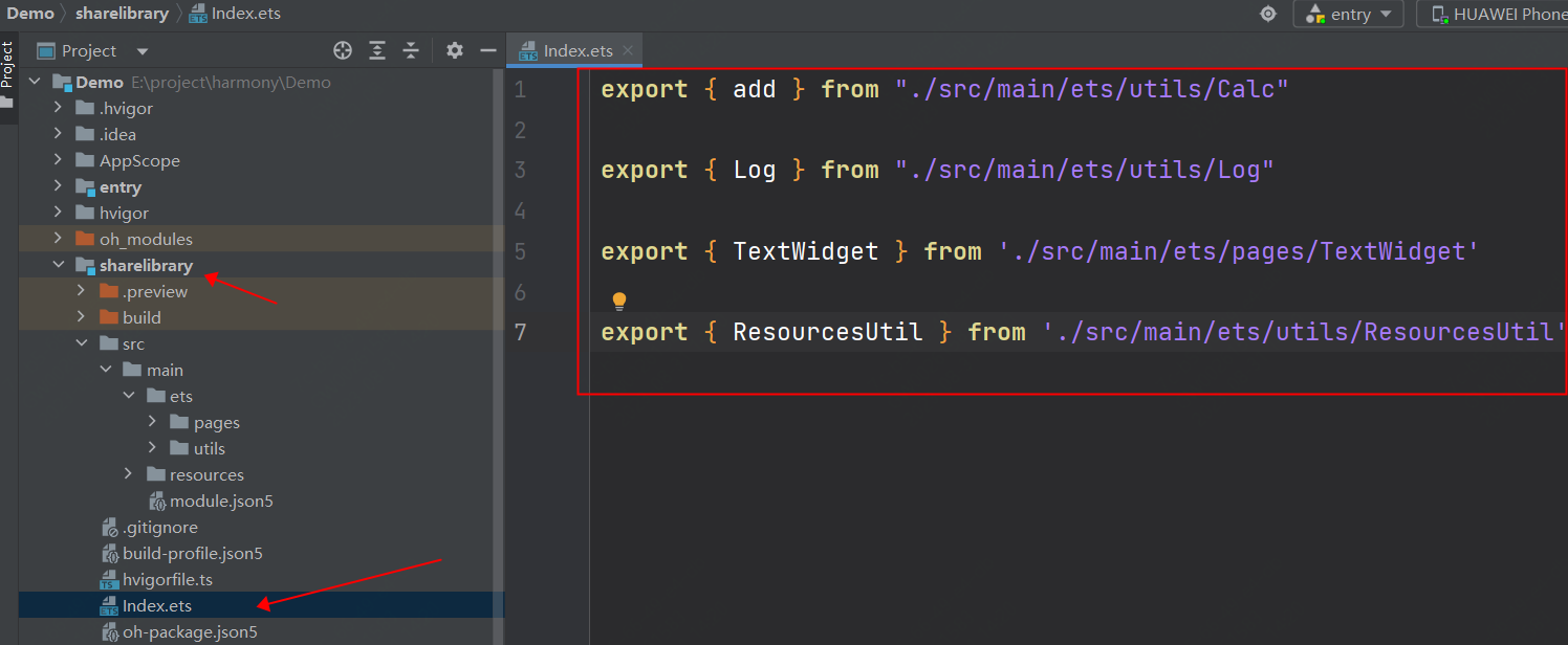 entry如果想要调用sharelibrary中的代码或资源,那么必须让entry关联上sharelibrary,关联方式和Android中类似。