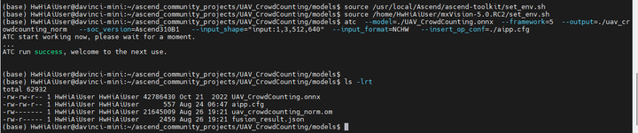 atc --model=./UAV_CrowdCounting.onnx --framework=5 --output=./uav_crowdcounting_norm --soc_version=Ascend310B1 --input_shape="input:1,3,512,640" --input_format=NCHW --insert_op_conf=./aipp.cfg