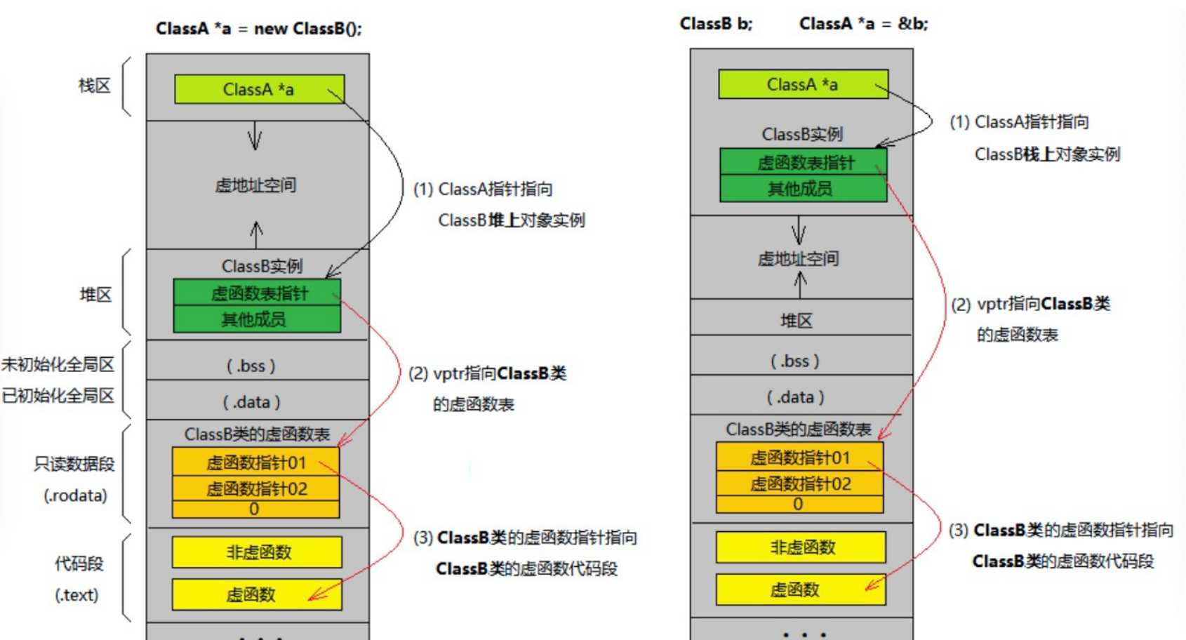 编译器虽然通过指针的指向来访问成员变量,但是却不通过指针的指向来访问成员函数:编译器通过指针的类型来访问成员函数。对于 pa,它的类型是 A,不管它指向哪个对象,使用的都是 A 类的成员函数,具体原因已在《C++函数编译原理和成员函数的实现》中做了详细讲解。