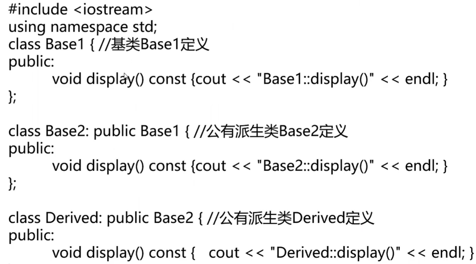 除了可以将派生类对象赋值给基类对象(对象变量之间的赋值),还可以将派生类指针赋值给基类指针(对象指针之间的赋值)。我们先来看一个多继承的例子,继承关系为: