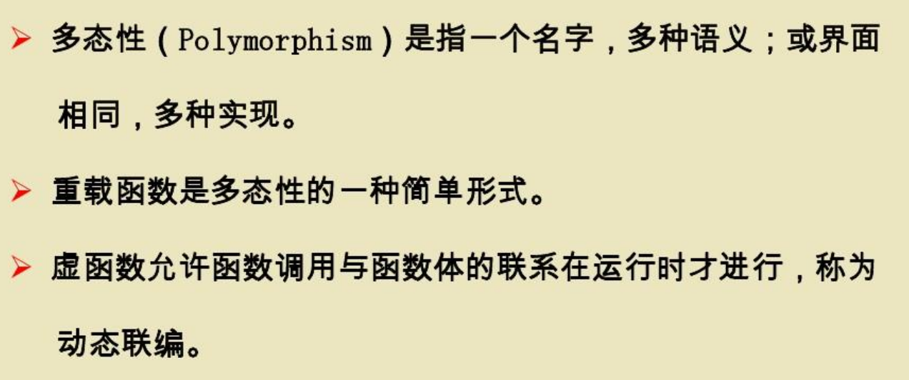 有了虚函数,基类指针指向基类对象时就使用基类的成员(包括成员函数和成员变量),指向派生类对象时就使用派生类的成员。换句话说,基类指针可以按照基类的方式来做事,也可以按照派生类的方式来做事,它有多种形态,或者说有多种表现方式,我们将这种现象称为多态(Polymorphism)。上面的代码中,同样是p->display();这条语句,当 p 指向不同的对象时,它执行的操作是不一样的。同一条语句可以执行不同的操作,看起来有不同表现方式,这就是多态。