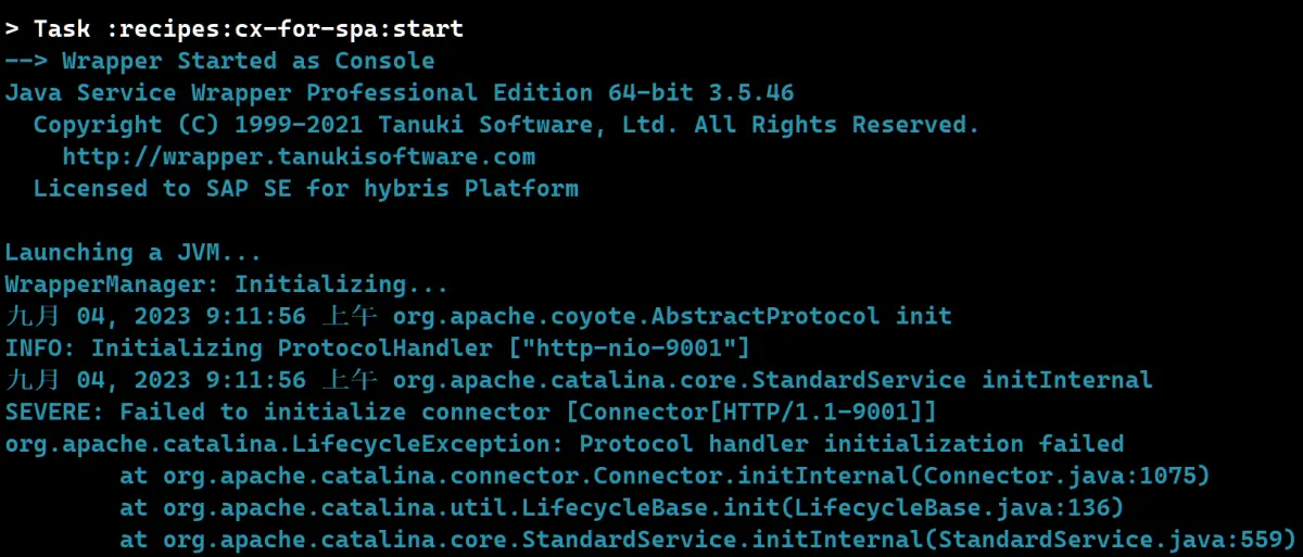 SEVERE:这是日志级别,表示这是一个严重的错误。Failed to initialize connector:表示连接器初始化失败。[Connector HTTP/1.1-9001]:这部分指定了连接器的类型和标识符,其中 “HTTP/1.1-9001” 可能是连接器的名称或标签。