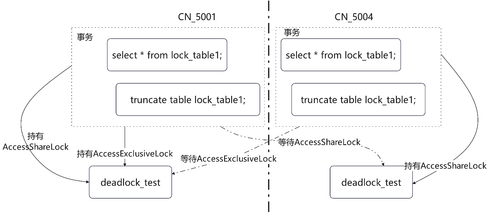 CN_5001的truncate语句线程号为:139887210493696;在等待线程号为:139887432832768的truncate语句释放lock_table1的AccessShareLock(事务中select语句持有的锁),同时该线程:139887210493696,持有lock_table1的AccessExclusiveLock;