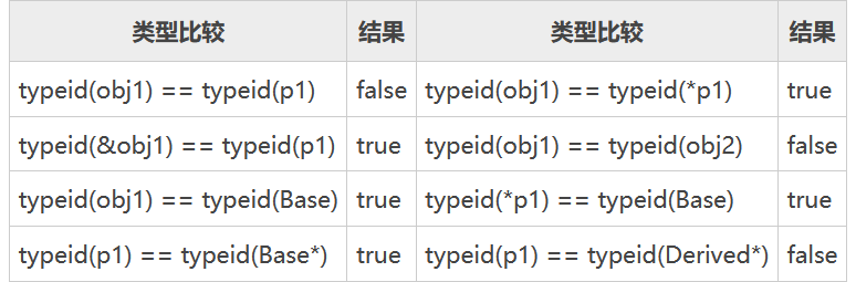 表达式typeid(*p1) == typeid(Base)和typeid(p1) == typeid(Base*)的结果为 true 可以说明:即使将派生类指针 p2 赋值给基类指针 p1,p1 的类型仍然为 Base*。