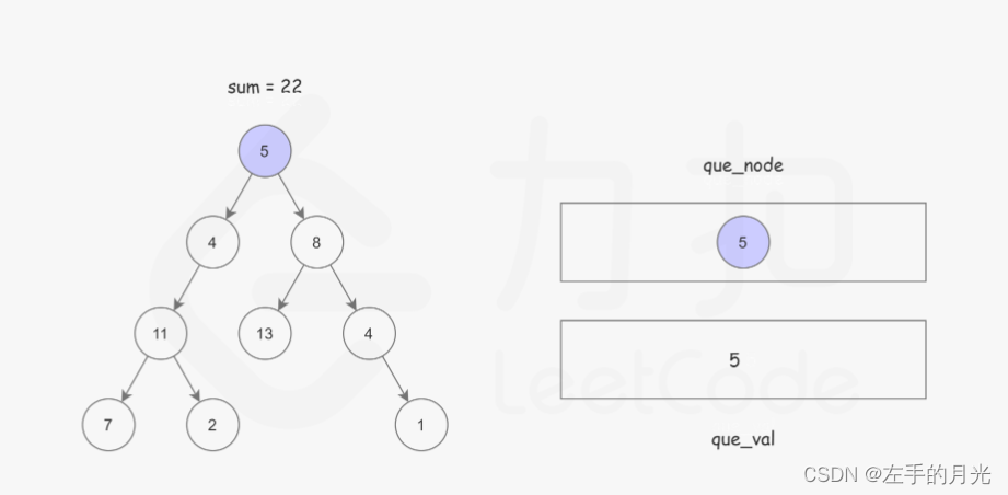 BFS:首先该结构是二叉树,采用链表存储,我们利用BFS,建立两个队列,一个队列存储节点路径,另一个队列存储该路径的和;