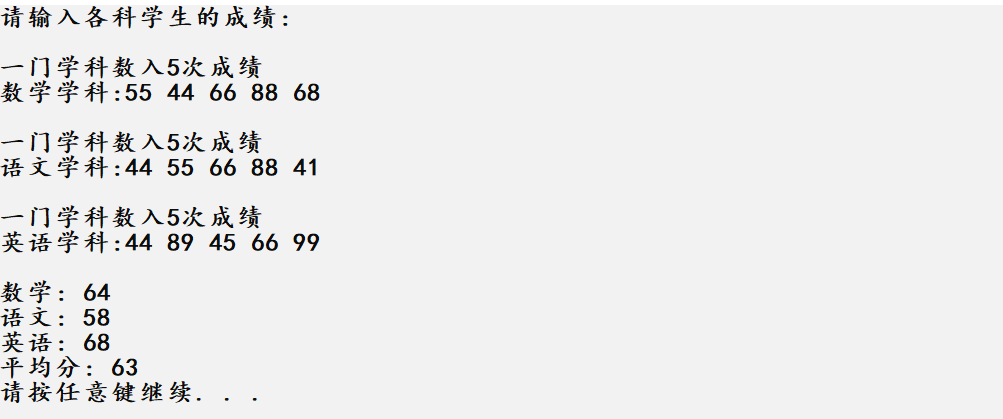练习1:一个学习小组有 5 个人,每个人有三门课的考试成绩。求全组分科的平均成绩和 各科总平均成绩。