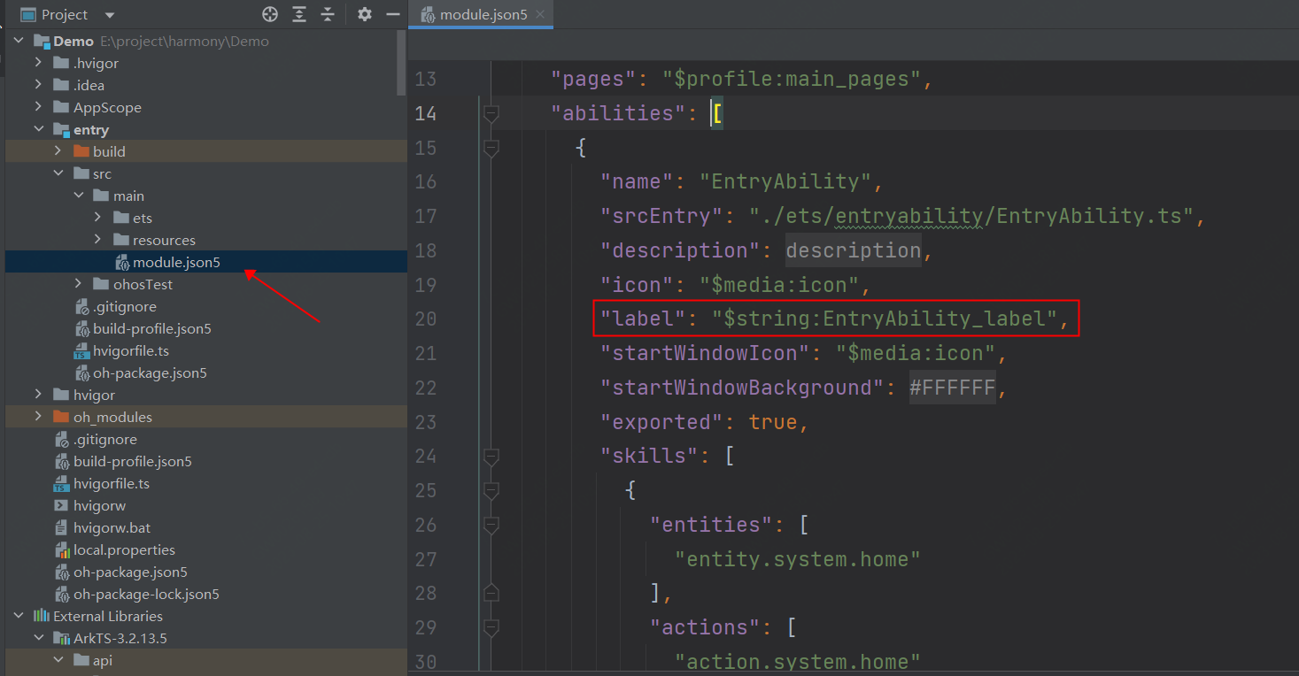 那么在HarmonyOS工程中呢,其实也是一样的简单,在前边讲述的工程结构中,我们知道Android中的清单文件AndroidManifest.xml,就是类似于HarmonyOS中module.json5,那么更改应用的名字,也是在这个文件内。