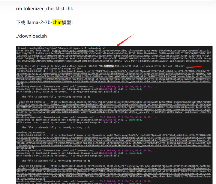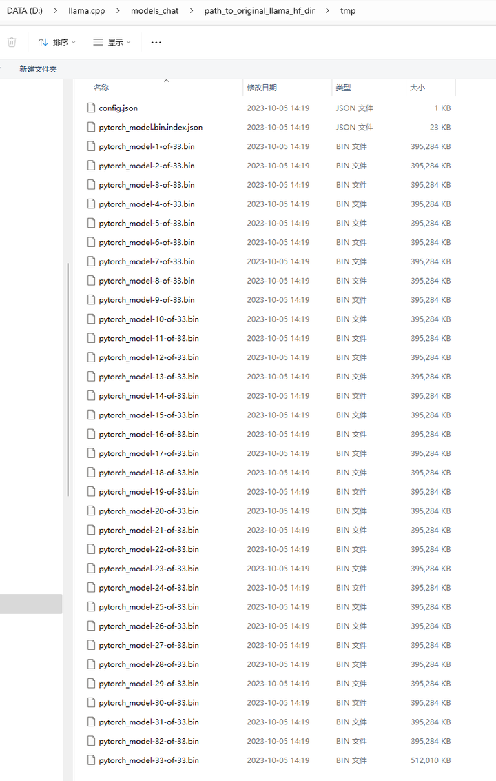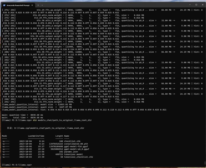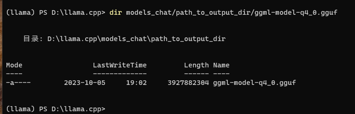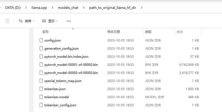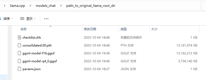 所以放入D:\llama.cpp\models_chat\path_to_original_llama_root_dir 目录的不应该是 llama-2-7b-chat模型,而应该选择 llama-2-7b模型。