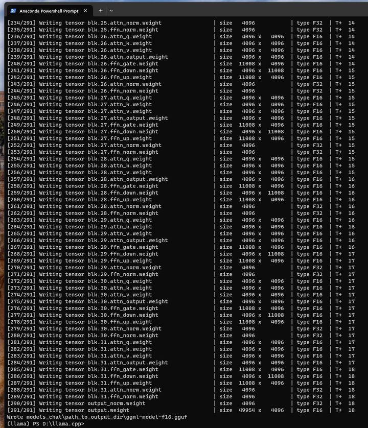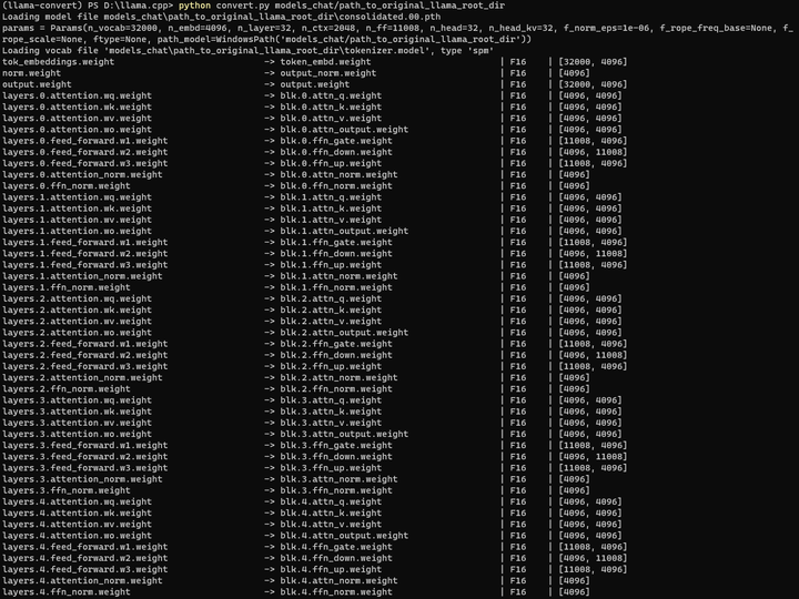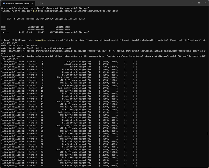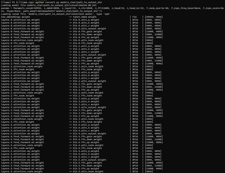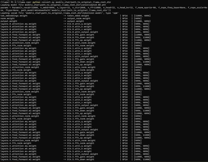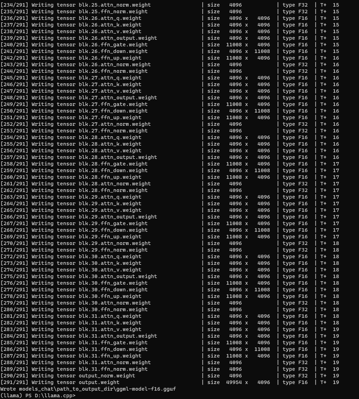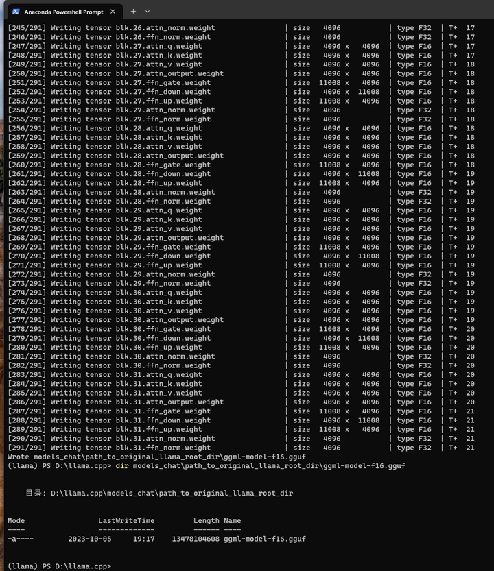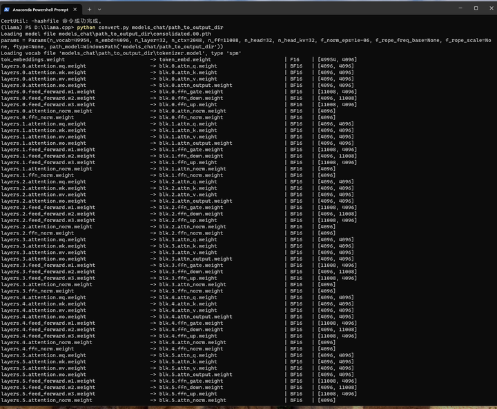 将合并后的模型权重 models_chat\path_to_output_dir\consolidated.00.pth 转换为ggml的FP16格式:ggml-model-f16.gguf,保存在 models_chat/path_to_output_dir 目录下。