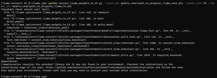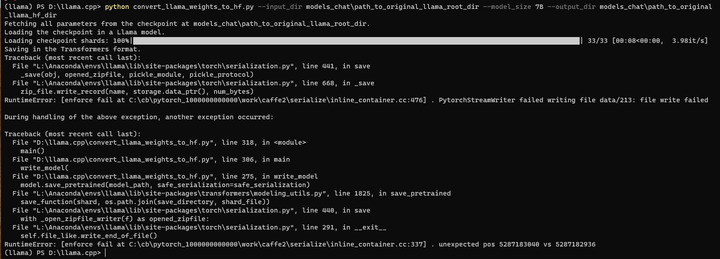 (llama) PS D:\llama.cpp> python convert_llama_weights_to_hf.py --input_dir models_chat\path_to_original_llama_root_dir --model_size 7B --output_dir models_chat\path_to_original_llama_hf_dir