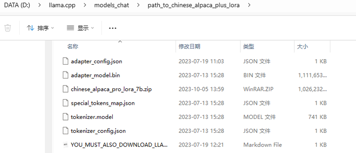 解压到 D:\llama.cpp\models_chat\path_to_chinese_alpaca_plus_lora 目录: