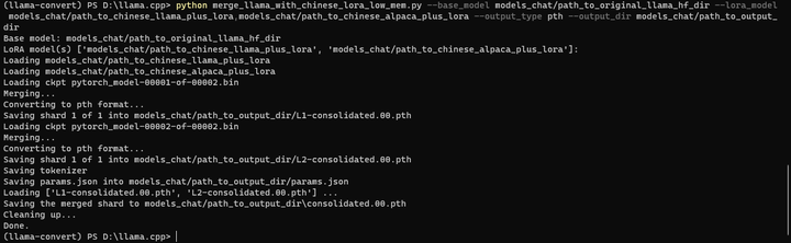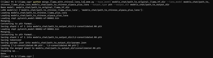 python merge_llama_with_chinese_lora_low_mem.py --base_model models_chat/path_to_original_llama_hf_dir --lora_model models_chat/path_to_chinese_llama_plus_lora,models_chat/path_to_chinese_alpaca_plus_lora --output_type pth --output_dir models_chat/path_to_output_dir